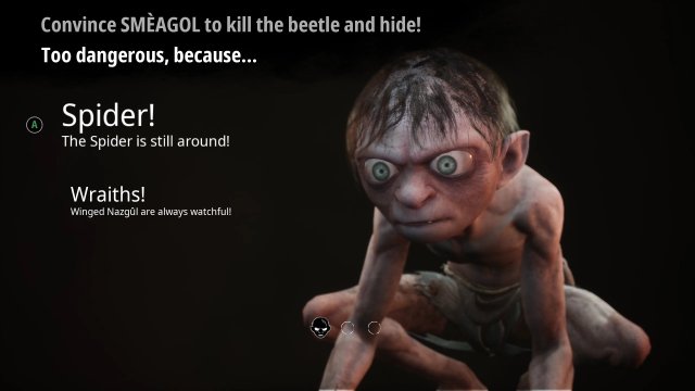 Most of the other 5% of gameplay is the occasional puzzle. Early on you’re taught (very poorly, I might add) how to use Companion Mode, which lets you direct an NPC to a specific objective. In addition to being poorly executed, only letting you choose from a limited group of nodes that you can’t see until you look at them, you’ll only use this a whopping three whole times over the course of the entire game, and you never use it again past the half-way point. Other puzzles involve hatching a bird out of an egg with vague instructions, piecing together an attack on a group of elves by using the “Gollum vision” to see trails to pieces of evidence, and connecting dots on a giant door to make a deer shape. If I didn’t forget any, those are all the puzzles in the game. It’s very meager. Finally, there are the famous arguments that have seen widespread scrutiny online, where every so often Gollum and his alternate persona Sméagol have conflicting interests and you as the player have to pick a side. When you do, you have to convince the other ego to come around, with the reward for doing so being neglible impact on the overall plot, and virtually no impact on the overall gameplay. I think there was maybe one choice in the entire game that mattered.